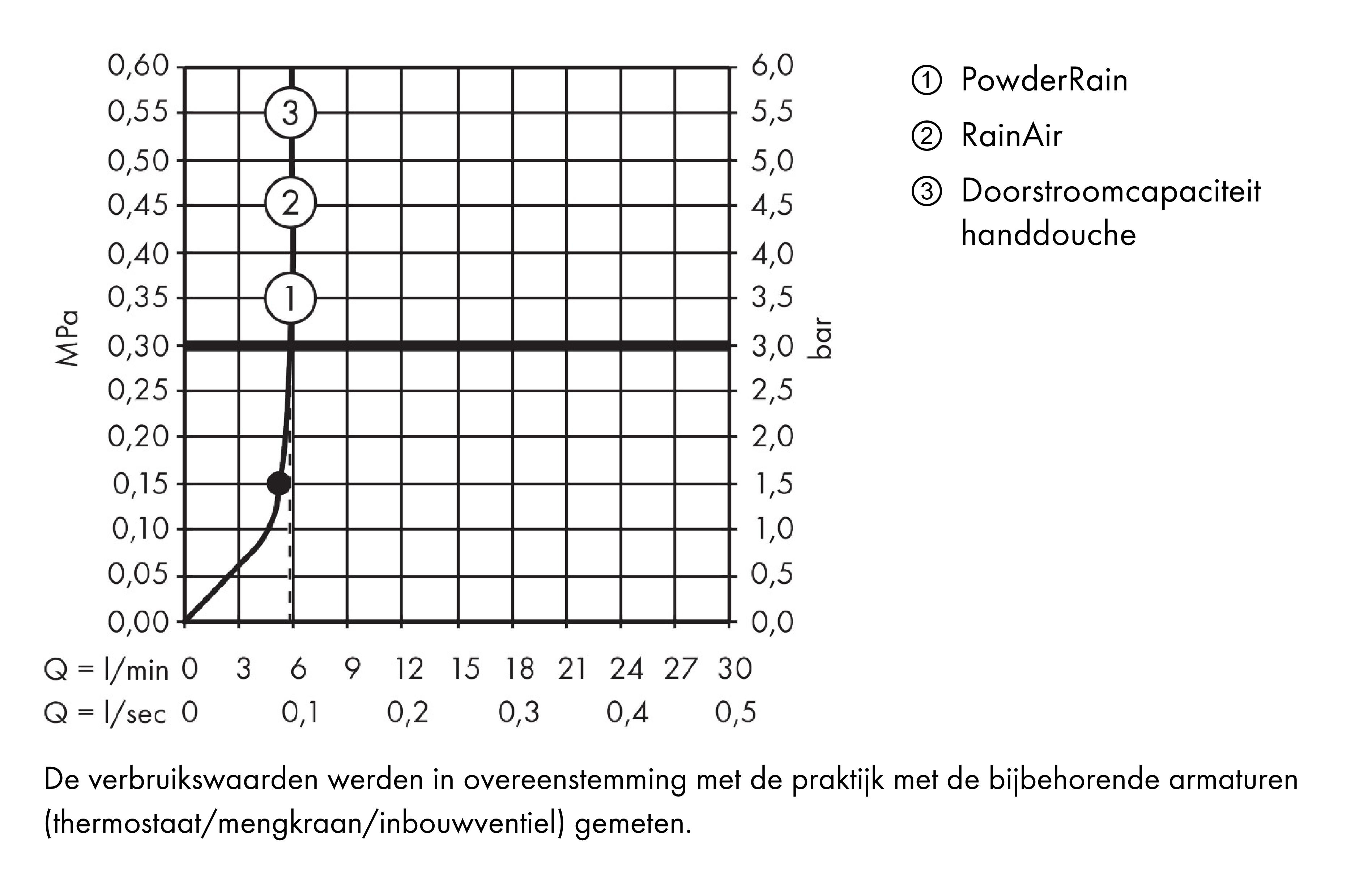 - Bij een lagere waterdruk dan 3bar: 1,5 l/min